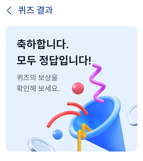 3. 퀴즈를 다 풀고 응모하시면 아래와 같이 "축하합니다. 모두 정답입니다."라고 뜨면 정상적으로 응모가 완료된 것입니다.