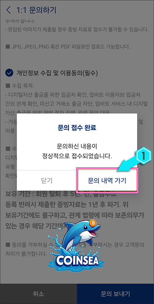 11. 출금주소 등록 신청이 정상적으로 접수되었습니다. "문의 내역 가기"를 클릭합니다.